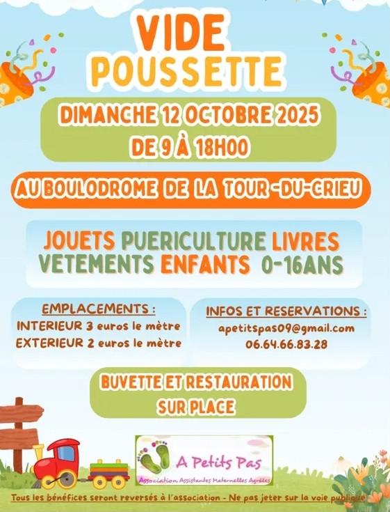 L'association A Petits Pas a le plaisir de vous convier à la cinquième édition de son Vide Poussette qui se déroulera le dimanche 12 octobre 2025 au Boulodrome de La Tour du Crieu !