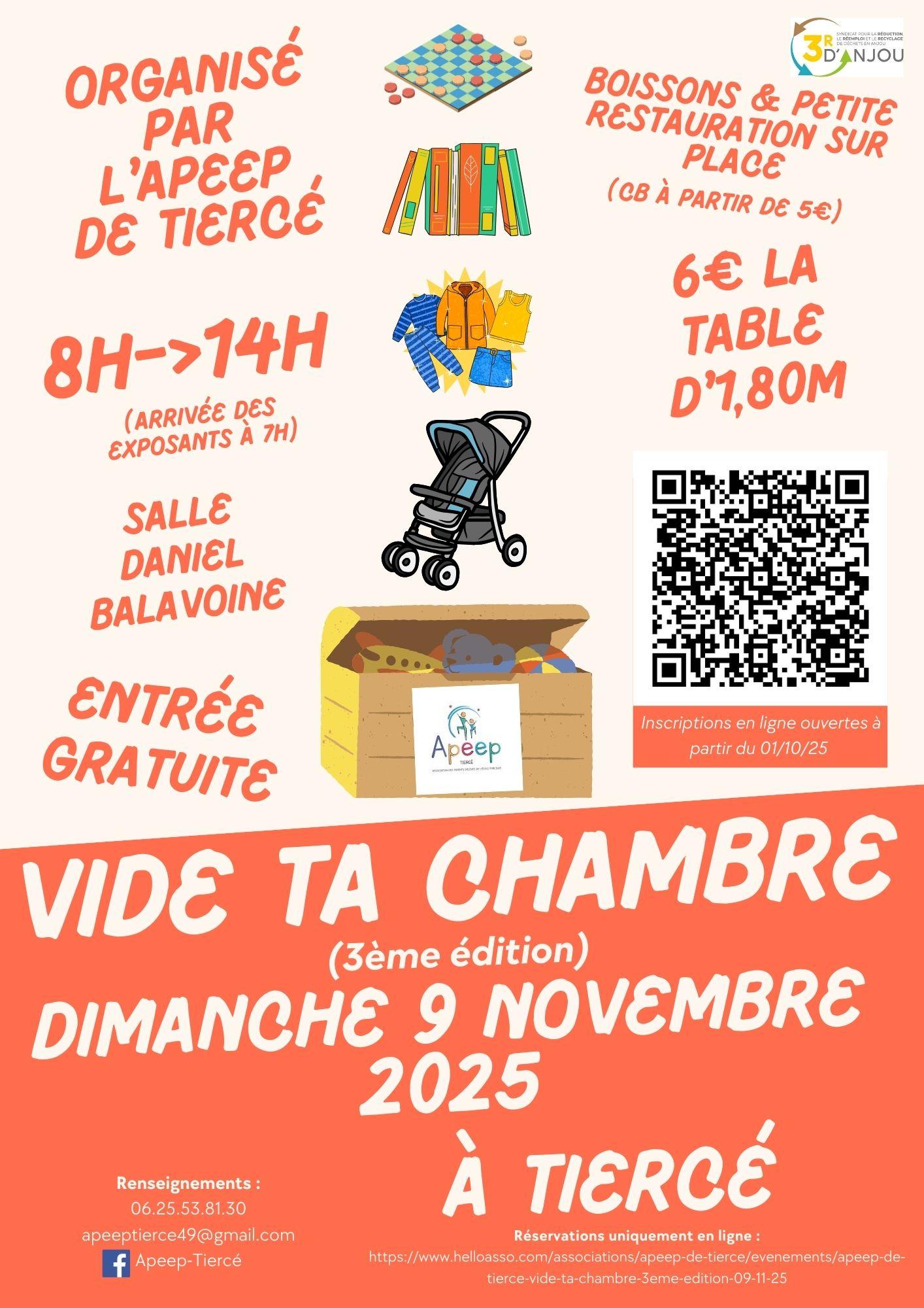 Vous pouvez vous inscrire dès à présent sur HelloAsso (https://www.helloasso.com/associations/apeep-de-tierce/evenements/apeep-de-tierce-vide-ta-chambre-3eme-edition-09-11-25?_gl=1%2azvghwp%2a_gcl_au%2aOTUzMTM4My4xNzU0OTg2Njc4LjE1MTgxMzQ4MzYuMTc1ODg4MjI0MC4xNzU4ODgyMjQw