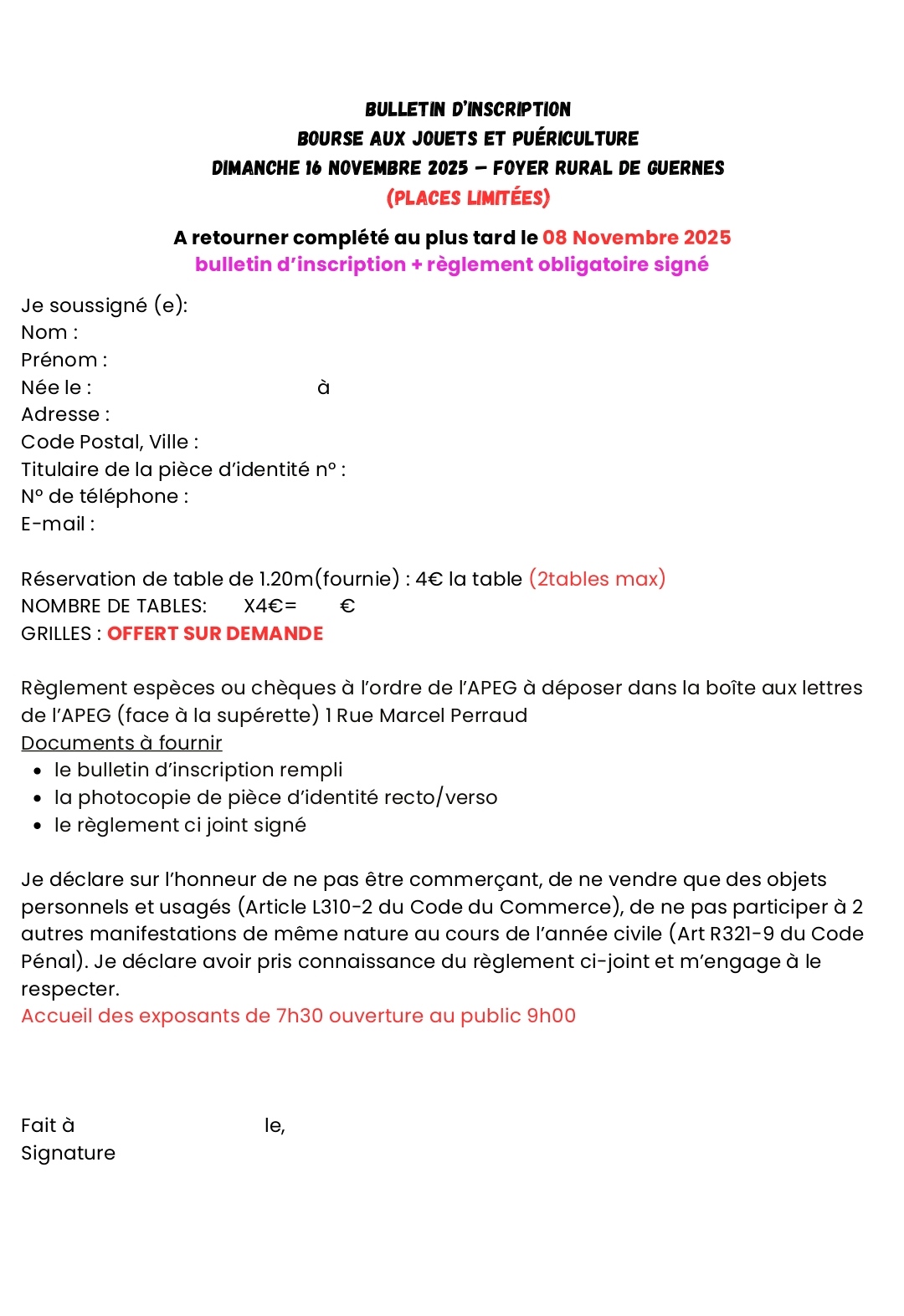 Inscription uniquement par mail: 78520apeg@gmail.com
