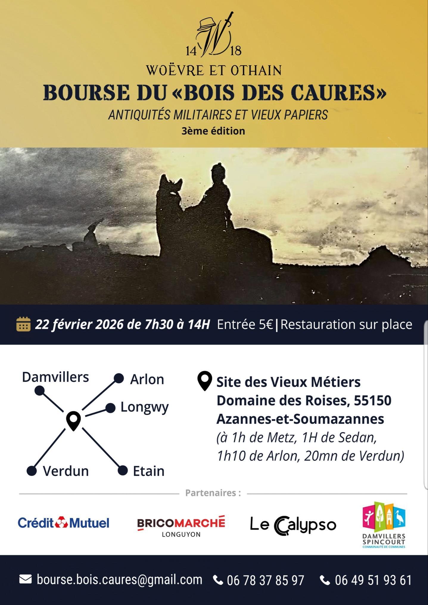 Suite au succès de ses deux premières bourses aux Antiquités Militaires et Vieux Papiers du "Bois des Caures", l'Association WOËVRE ET OTHAIN 14/18 a le plaisir de vous convier à la troisième édition, prévue le Dimanche 22 FÉVRIER 2026, au Domaine des Roises, à AZANNES-ET-SOUMAZANNES (55), de 7H30 à 14H00.
