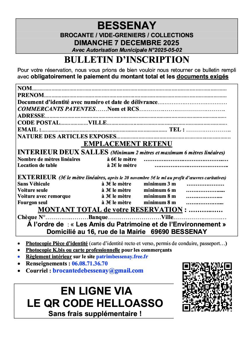 - Emplacements intérieurs dans 2 salles : salle polyvalente Jean Guilloud (22 rue Saint Irénée) et salle des fêtes (17 rue du Prado). Réservation obligatoire. Tarif : 6 €/m, 2 € le mètre de table (2 m mini, 6 m maxi). - Emplacements extérieurs dans 2 rues : rue Saint Irénée et rue du Prado. Réservation conseillée. Tarif : 2,50 €/m (les exposants non-inscrits peuvent se présenter le jour de la manifestation sans accord préalable, mais le tarif appliqué sera de 4 euros par mètre linéaire occupé). Inscriptions à partir du 1er septembre !