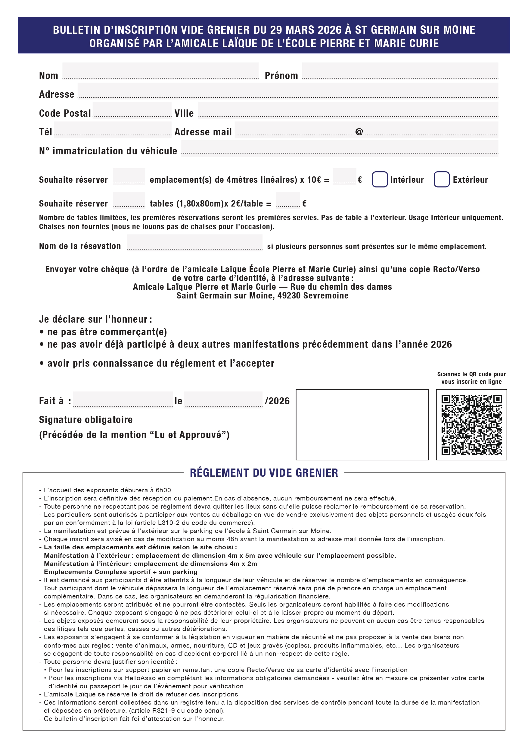 Lien HelloAsso : https://www.helloasso.com/associations/amicale-laique-saint-germain-sur-moine/evenements/vide-grenier-st-germain-sur-moine-dimanche-29-mars