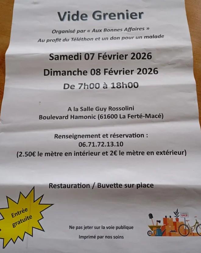 Vide grenier au profit du téléthon et un don pour un malade. Du samedi 07 février et dimanche 08 février de 7 h a 18 h a la salle Guy Rossolini boulevard Hamonic 61600 LA FERTE MACE