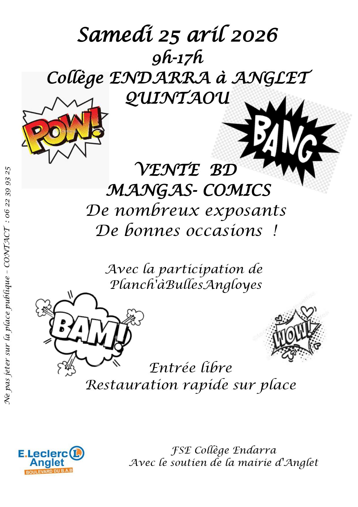 Vente d'occasions de bandes dessinées, mangas et comics avec de nombreux exposants. L'entrée est libre, vous trouverez de quoi vous restaurer sur place (sandwichs, boissons, thé, café, gâteaux..). L'espace est abrité et des toilettes sont disponibles.