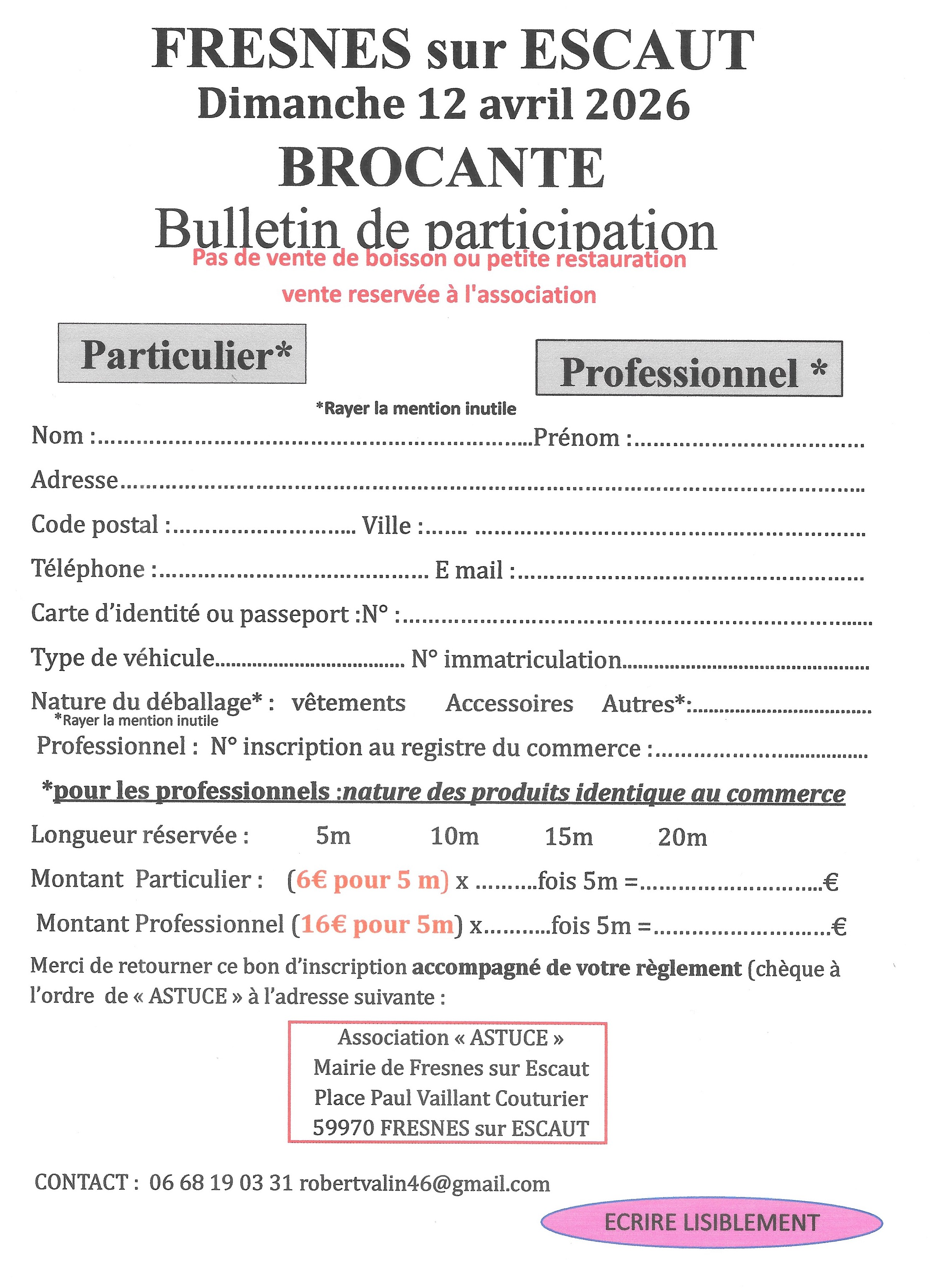 Par courrier postal à Association ASTUCE Mairie de Fresnes-sur-Escaut Place Vaillant Couturier 59970 FRESNES-SUR-ESCAUT