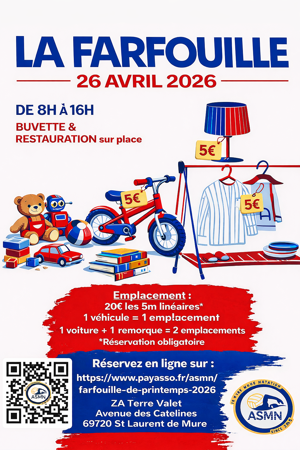 TARIF : 20€ - emplacement de 5 mètres 1 véhicule par emplacement 1 voiture + 1 remorque = 2 emplacements Inscriptions en ligne : https://www.payasso.fr/asmn/farfouille-de-printemps-2026