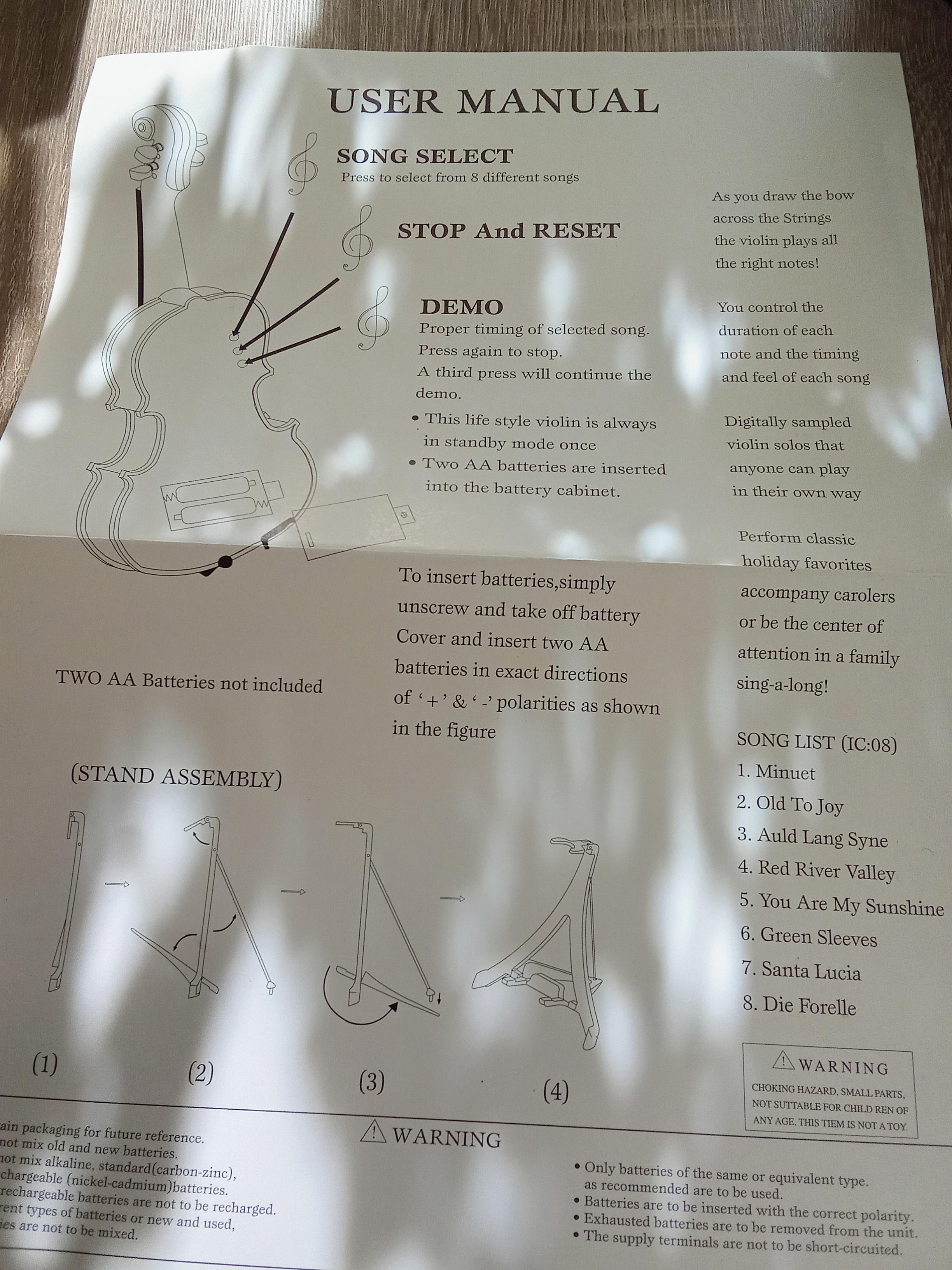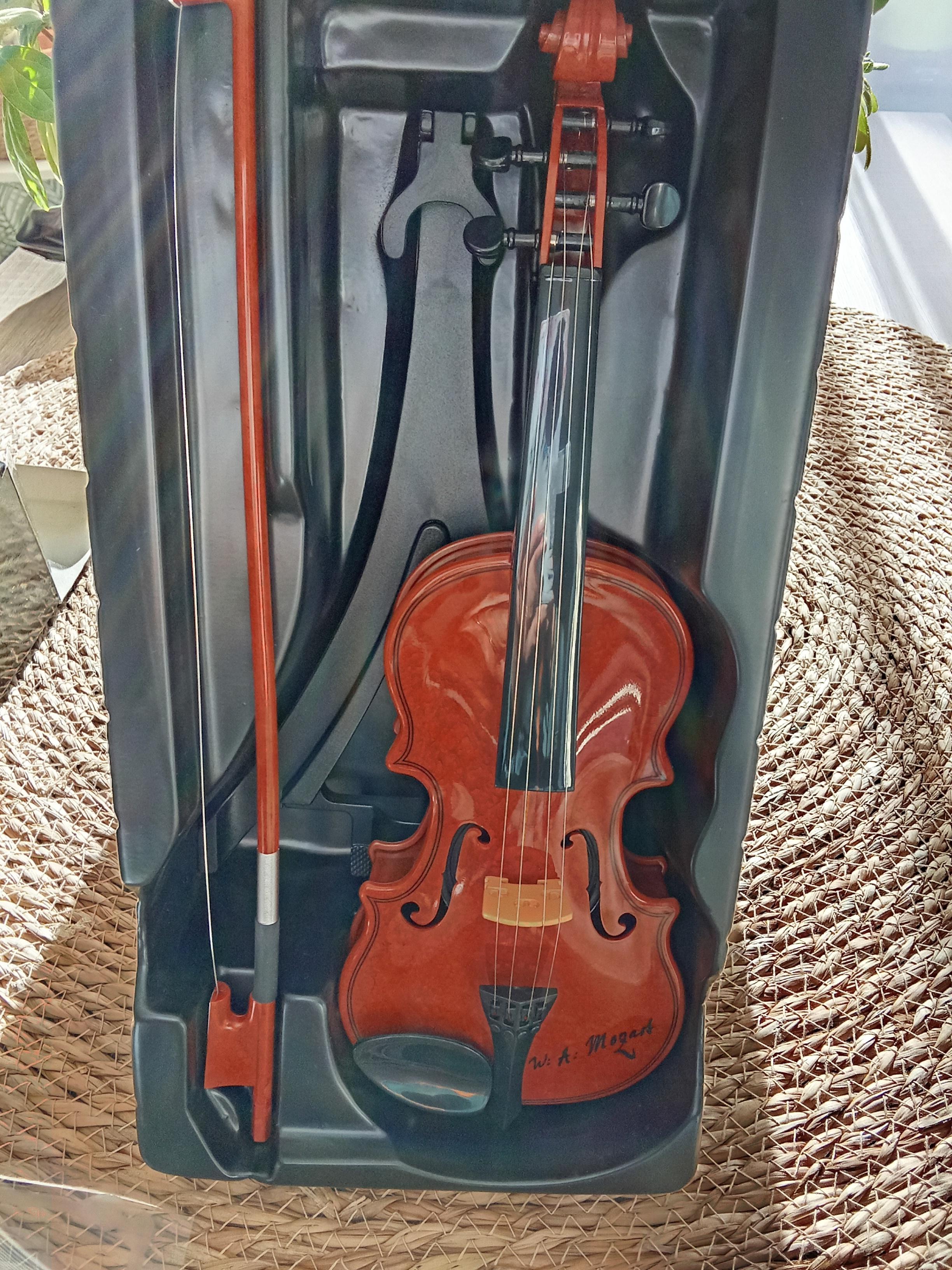Petit violon musical marron. Neuf, piles comprises plus boîte.