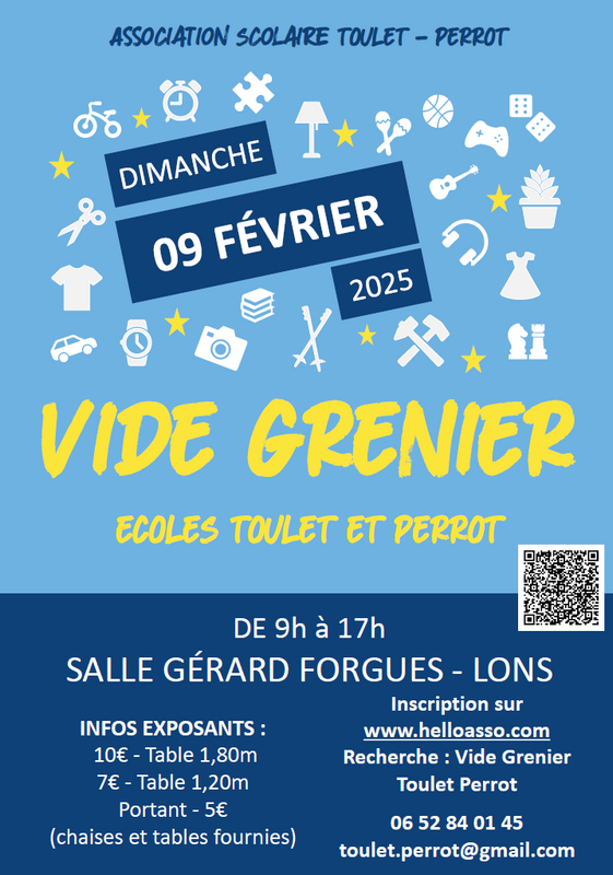 Inscription directement sur le site www.helloasso.com en recherchant vide grenier toulet perrot ou en utilisant le lien suivant :