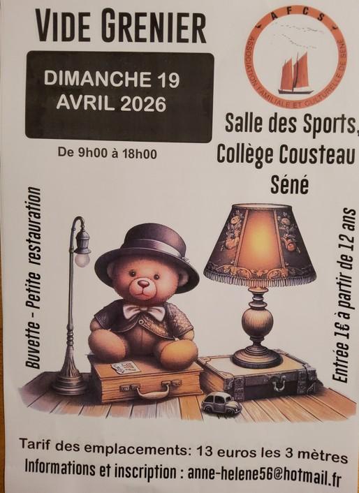 Cette manifestation se déroulera dans la salle de sports du collège Cousteau à Séné de 6 h à 18 h. Le déballage s’effectue entre 6 h et 7 h30. Toute place non occupée à 8h pourra être revendue et non remboursée. Le choix des emplacements sera décidé par les organisateurs lors de l’inscription. Les personnes s’inscrivant le jour même devront se munir d’une copie recto-verso de leur carte d’identité ou de l’extrait du registre du commerce de moins de 3 mois pour les professionnels. Les organisateurs ne pourront en aucun cas être tenus responsables des vols, dégradations ou accidents survenus au cours de la manifestation. Dans cet esprit, chaque participant déclare faire son affaire personnelle de toutes assurances concernant ce vide-greniers et déclare renoncer à tous les recours à l’encontre des organisateurs, ses assurances et la ville en cas de dommages. Les exposants s’engagent à laisser leurs emplacements propres et donc à débarrasser leurs cartons et invendus.