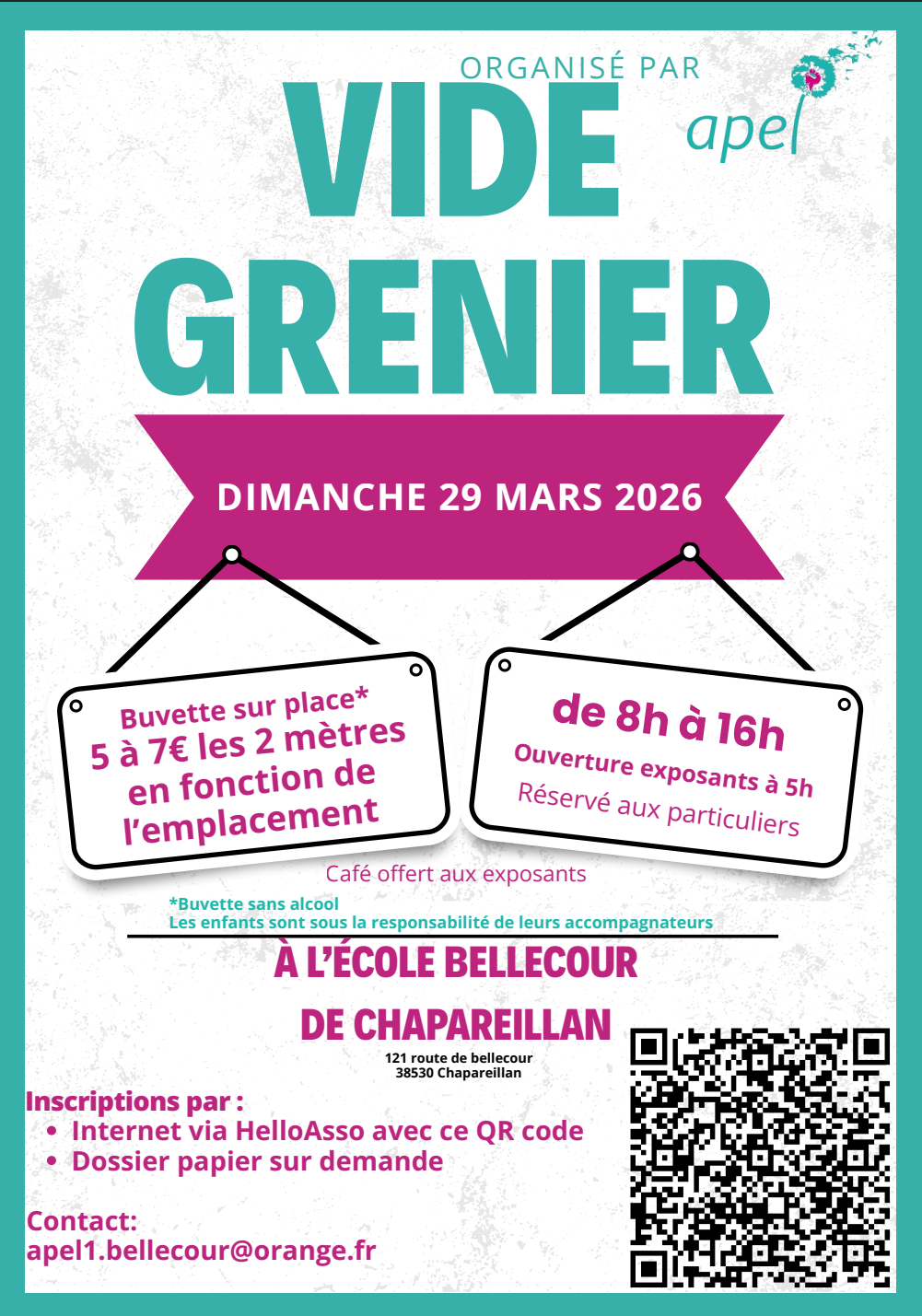 Inscriptions : via HelloAsso (https://www.helloasso.com/associations/association-de-parents-d-eleves-de-l-enseignement-libre-apel-de-l-ecole-bellecour/evenements/vide-grenier) ou en version papier sur demande.