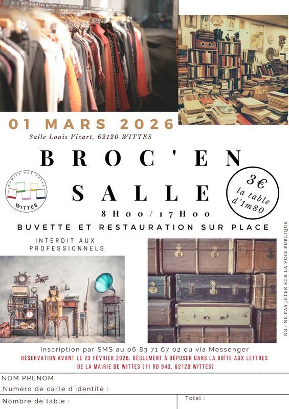 Règlement à déposer dans la boîte au lettre de la mairie de wittes (11 rd 943, 62120 wittes) avant l’événement pour assurer l’emplacement.