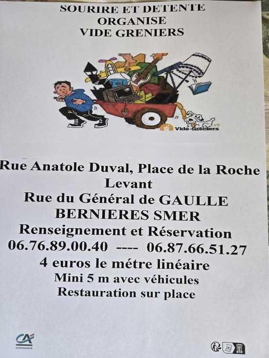 L'association sourire et détente organise son 19éme vide-greniers , 100exposants, le dimanche 29 mars à BERNIERES SUR MER rue Anatole Duval, Charles de Gaulle de 08h00 à 18h00. Tarif:4€ le m. (5 m. minimum si véhicule). Réservation obligatoire. Exposants en alimentaires refusés. Restauration sur place: saucisses, frites maison, crêpes, teurgoule, gâteaux, Buvette.