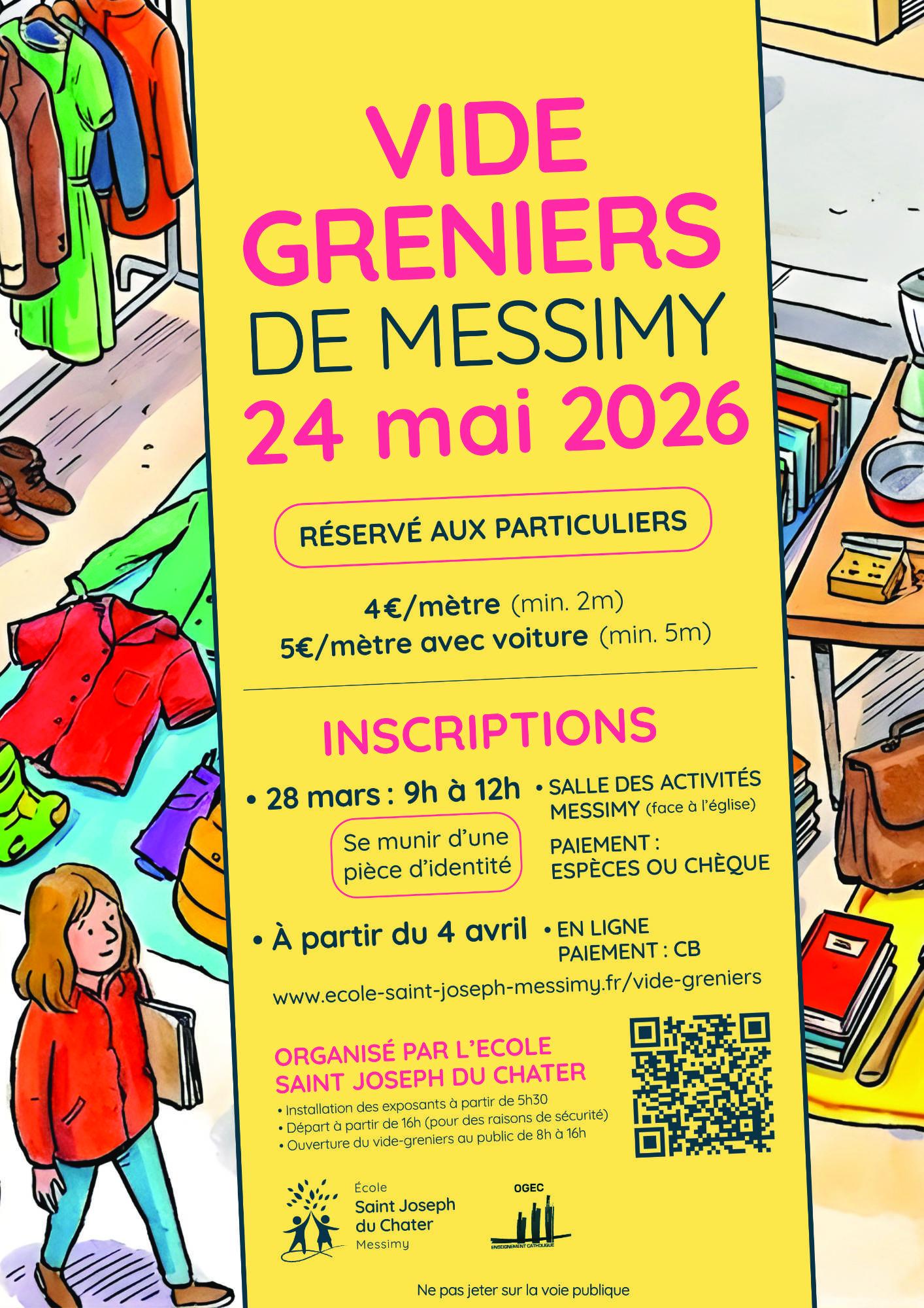 - Inscriptions : sur internet à partir du 4 Avril (www.ecole-saint-joseph-messimy.fr/vide-greniers/) OU en présentiel le 6 Avril de 9h à 12h à la salle des activités de Messimy."