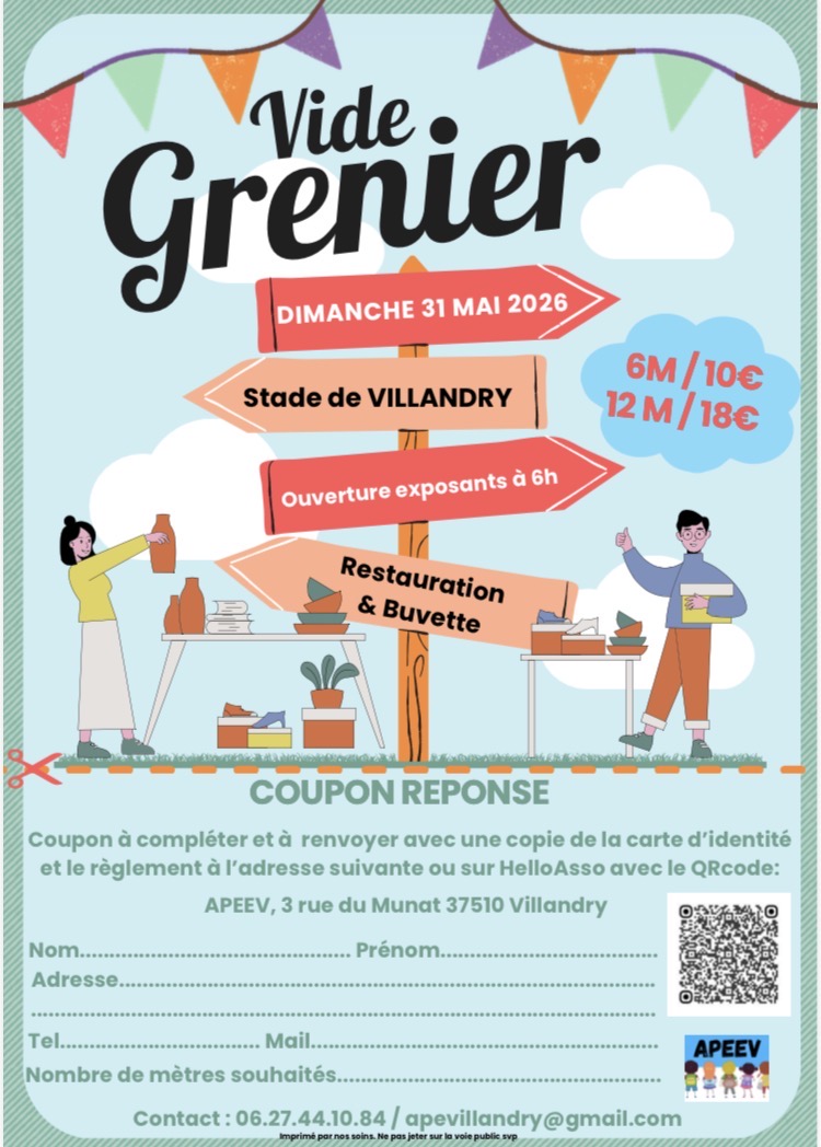 Rendez vous le dimanche 31 mai 2026 au vide greniers annuel de l'APE de Villandry