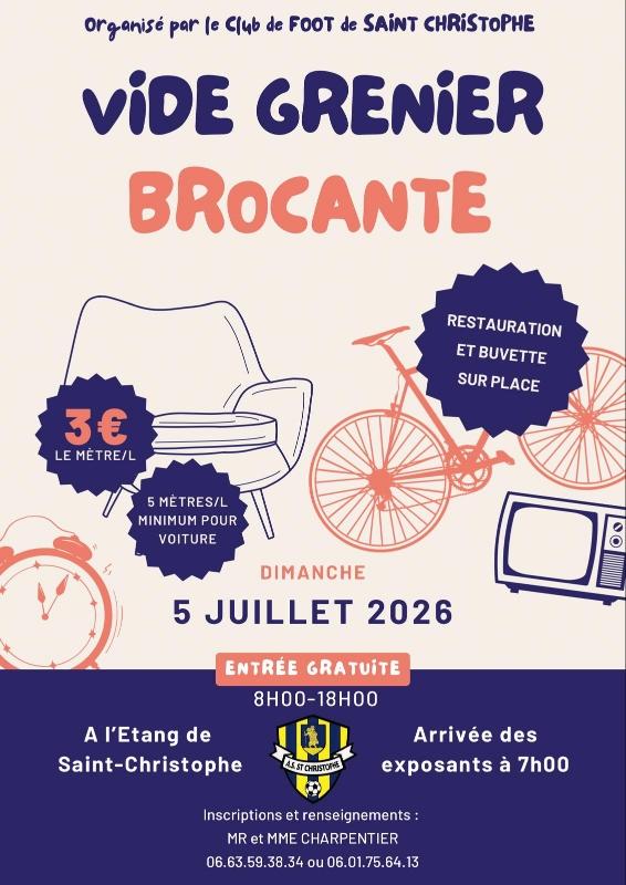 L' Association sportive football Saint Christophe organise son vide grenier le dimanche 5 juillet 2026 de 8h00 Ã 18h00 au stade de football de Saint Christophe.